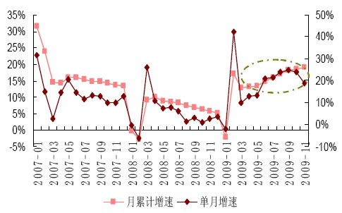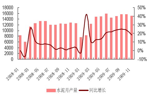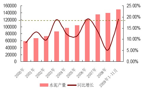 全年水泥產(chǎn)量增速創(chuàng)2000年以來新高。4萬億投資計(jì)劃的推出帶來的基建投資高增長對于今年水泥需求拉動效應(yīng)非常明顯,水泥行業(yè)景氣度在2008年的底部基礎(chǔ)上快速拉升,尤其是進(jìn)入下半年,水泥月增速創(chuàng)近幾年來最高水平。1-11 月水泥產(chǎn)量14.92 億噸,同比增長19%,預(yù)計(jì)全年超過16 億噸,比去年新增水泥產(chǎn)量2.5 億噸。 圖1:2009年產(chǎn)量增速與03、06年最高值相當(dāng)