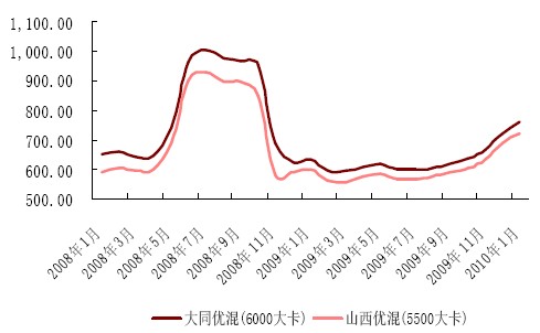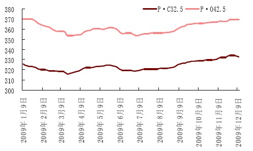 圖3:2009年水泥月產(chǎn)量增速變化 上半年量增價(jià)減,下半年量價(jià)齊升。09 年上半年水泥產(chǎn)量增速基本上依靠鐵路、公路等基建設(shè)施需求拉動,下半年房地產(chǎn)投資的回暖和基建投資持續(xù)高增長雙因素帶動,下半年水泥行業(yè)景氣高于上半年,從水泥價(jià)格可以明顯看出,如圖所示。 |
