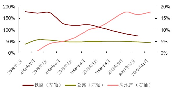 圖5:2009年以來鐵路、公路、房地產(chǎn)月累計(jì)增速變化