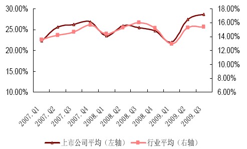煤炭價(jià)格總體運(yùn)行平穩(wěn) 水泥行業(yè)季度毛利率環(huán)比、同比均回升。水泥行業(yè)成本中煤炭占比約占30%左右,水泥盈利水平變化對煤炭價(jià)格敏感度較高。相比2008年煤炭價(jià)格的大幅波動,09年煤炭價(jià)格總體上運(yùn)行平穩(wěn)。三季度水泥上市公司毛利率28.57%,比二季度環(huán)比提高1 個(gè)百分點(diǎn),比去年同期提高3 個(gè)百分點(diǎn),超過07年的最高值,統(tǒng)計(jì)局?jǐn)?shù)字顯示,1-8月的水泥行業(yè)總體毛利率達(dá)到15.4%,環(huán)比提高0.2 個(gè)百分點(diǎn),總體上看,水泥行業(yè)盈利水平達(dá)到了較高水平。9 月份以后受大范圍降雪以及冬季供暖等因素影響,煤炭價(jià)格出現(xiàn)反彈,從我們每周跟蹤的數(shù)據(jù)上看,水泥企業(yè)通過連續(xù)提價(jià)的方式轉(zhuǎn)移了煤炭上漲帶來的成本壓力,預(yù)計(jì)四季度行業(yè)盈利水平仍可以維持三季度高水平。