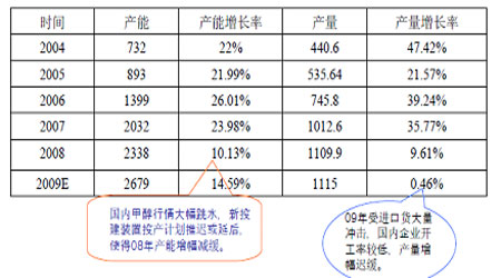 近年來(lái)國(guó)家大力推進(jìn)石油替代戰(zhàn)略,我國(guó)甲醇行業(yè)發(fā)展迅速,產(chǎn)能擴(kuò)張步伐加快,僅五年時(shí)間,國(guó)內(nèi)甲醇產(chǎn)能就增加了四倍之多。08年受金融危機(jī)的影響,部分廠家新建裝置投產(chǎn)計(jì)劃推遲,國(guó)內(nèi)產(chǎn)能增長(zhǎng)率減緩,增幅在10%。隨著國(guó)民經(jīng)濟(jì)的復(fù)蘇,2010的國(guó)內(nèi)新建產(chǎn)能將會(huì)集中投產(chǎn),屆時(shí)國(guó)內(nèi)產(chǎn)能將突破3000萬(wàn)。