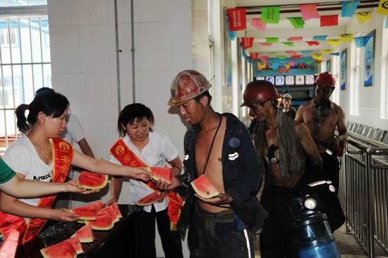 “師傅,下井辛苦了,吃塊西瓜降降溫吧!” 7月22日中班,淮北礦業(yè)楊柳礦婦女協(xié)安員和青安崗員到井口為職工師傅們送上清涼甘甜的西瓜和安全祝福。