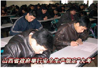 8月29日,一場(chǎng)關(guān)于安全生產(chǎn)的特別考試在省政府舉行?荚噧(nèi)容很特別,是山西省政府最近出臺(tái)的各重點(diǎn)行業(yè)領(lǐng)域安全生產(chǎn)工作規(guī)定;"考生"很特別,是各市市長(zhǎng)、分管安全生產(chǎn)工作的副市長(zhǎng),省煤炭工業(yè)廳、省安監(jiān)局、省公安廳交通管理局等8個(gè)廳局 "一把手"和省屬七大煤炭集團(tuán)主要負(fù)責(zé)人。省委副書(shū)記、省長(zhǎng)王君,副省長(zhǎng)陳川平、張建欣等到現(xiàn)場(chǎng)巡考。