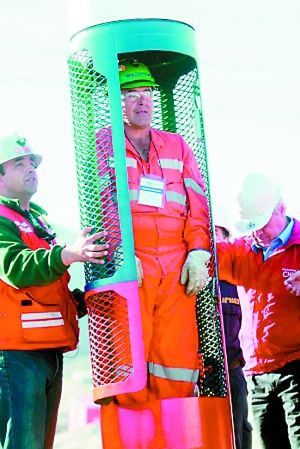 智利礦難中,礦工乘“鳳凰號(hào)”救生艙升井。