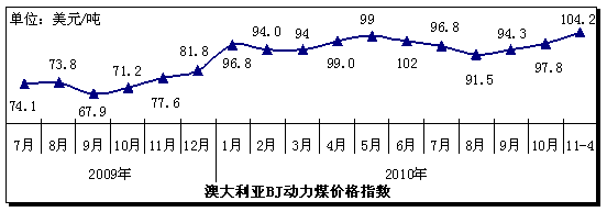 BJ指數(shù) 受寒冬預(yù)期影響,國際動力煤價格繼續(xù)反彈,截至11月4日,澳大利亞BJ標(biāo)準(zhǔn)動力煤價格指數(shù)報價為104.2美元/噸,比上周上漲2.58美元/噸。