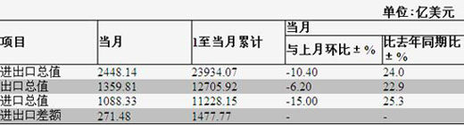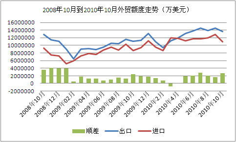 據(jù)海關總署10日公布的數(shù)據(jù)顯示,10月份中國進出口值2448.1億美元,同比增長24%,環(huán)比下降10.4%。其中出口1359.8億美元,同比增長22.9%,環(huán)比降6.2% ;進口1088.3億美元,同比增長25.3%,環(huán)比降15% 。10月份貿(mào)易順差為271.5億美元,相較9月份增加102.2億美元。