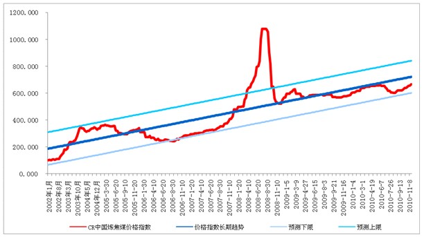 圖2 CR中國(guó)焦炭?jī)r(jià)格指數(shù)歷史趨勢(shì)及預(yù)測(cè)范圍