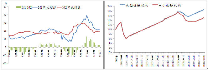 11月人民幣貸款增加5640億元,同比多增2692億元;10月新增外匯占款大幅上揚,當(dāng)月增加5190億元,環(huán)比增加79.31%。看好中國經(jīng)濟(jì)的未來發(fā)展,國內(nèi)資產(chǎn)價格的低估值,加上人民幣升值和加息的預(yù)期,使得逐利的國外資本繼續(xù)大規(guī)模流入國內(nèi)。前11個月的信貸投放已達(dá)7.4萬億,接近全年投放7.5萬億的紅線,12月份的投放量估計在3000億元左右,全年總投放將達(dá)7.8萬億,超出預(yù)定目標(biāo)。于是,央行采取了連續(xù)上調(diào)存款準(zhǔn)備金率等數(shù)量型和價格型貨幣工具來進(jìn)行調(diào)控,有意收緊貨幣,減少貨幣投放。大型金融機(jī)構(gòu)的存款準(zhǔn)備金率已創(chuàng)85年以來新高,后期還存在繼續(xù)上調(diào)的空間。