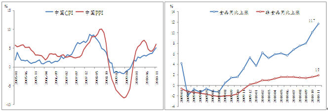 大量的貨幣投放是國內(nèi)的物價飆升、CPI高企的重要因素之一。11月份居民消費價格CPI同比上漲5.1%,工業(yè)品出廠價格PPI同比上漲6.1%。CPI連續(xù)5個月、PPI連續(xù)3個月同比上漲。主要原因是食品價格的大幅上揚,11月食品價格上漲11.7%,非食品價格只上漲1.9%。11月采掘工業(yè)上漲14.6%,原材料、燃料、動力購進(jìn)價格同比上漲9.7%,原材料價格和人工成本的上升推高了PPI的上漲,后期仍可能將維持高位。