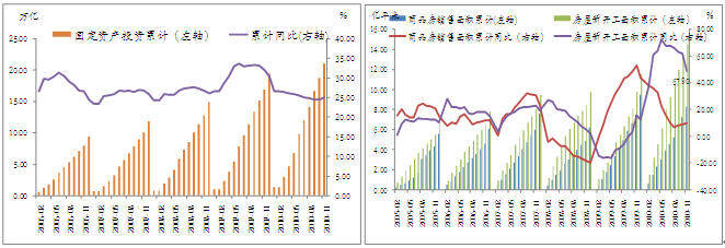 1-11月份,城鎮(zhèn)固定資產(chǎn)投資210698億元,同比增長24.9%,比1-10月份加快0.5個百分點。其中,房地產(chǎn)開發(fā)投資42697億元,增長36.5%。分產(chǎn)業(yè)看,1-11月份鐵路運輸業(yè)投資5822億元,增長25.3%,表現(xiàn)突出。從施工和新開工項目情況看,1-11月份累計施工項目439758個,同比增加10288個;施工項目計劃總投資498297億元,同比增長26.8%;新開工項目301937個,同比減少15075個;新開工項目計劃總投資172345億元,同比增長25.9%。前期開工項目的延續(xù)使得施工項目投資增速稍高于新開工項目投資,后期隨著天氣的轉(zhuǎn)冷,項目數(shù)量和增速也將出現(xiàn)回落。但我們依然看好“十二五”規(guī)劃頭年的固定資產(chǎn)投資表現(xiàn)。政策連續(xù)對房地產(chǎn)調(diào)控,商品房的銷售面積處于回落之中,新開工面積在11月份回落幅度較大,明年1000萬套的保障性住房建設(shè)將支撐房屋新開工面積的高增長。