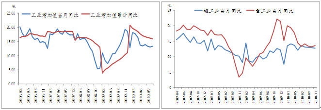 11月份規(guī)模以上工業(yè)增加值同比增長13.3%,比10月份加快0.2個百分點;1-11月份,規(guī)模以上工業(yè)增加值同比增長15.8%,比1-10月份回落0.3個百分點。分行業(yè)看,黑色金屬冶煉及壓延加工業(yè)增長4.9%,低于其他行業(yè);重工業(yè)增長13.6%,輕工業(yè)增長12.7%。分產(chǎn)品看,粗鋼5017萬噸,增長4.8%;水泥17658萬噸,增長17.3%;汽車182.1萬輛,增長27.6%。由于節(jié)能減排等影響,粗鋼產(chǎn)量增速較低,汽車等行業(yè)仍保持高的增速。重工業(yè)增速止跌反彈,輕工業(yè)繼續(xù)小幅回落。