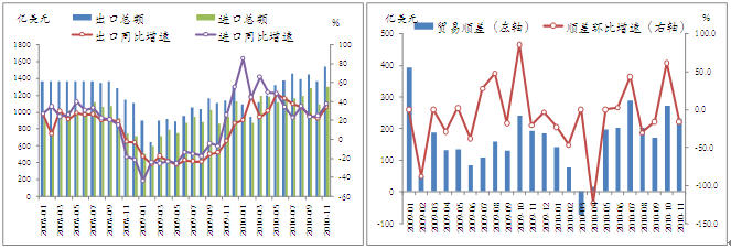 據(jù)海關(guān)統(tǒng)計,11月份,我國進(jìn)出口值2837.6億美元,同比增長36.2%,環(huán)比增長15.9%,刷新今年9月份創(chuàng)下的2730.9億美元的紀(jì)錄,月度進(jìn)出口規(guī)模首次超過2800億美元關(guān)口。其中出口、進(jìn)口值同時創(chuàng)新歷史最高紀(jì)錄:11月份出口1533.3億美元,增長34.9%;在進(jìn)口量和價格上漲的推動下,11月份進(jìn)口1304.3億美元,增長37.7%,進(jìn)口增速比10月份快速提升12.3個百分點。外商投資企業(yè)為貿(mào)易順差主要來源,這也是國外資本進(jìn)入國內(nèi)的一條重要途徑;民營企業(yè)進(jìn)出口強(qiáng)勁增長,新興國家的快速復(fù)蘇加大了對我國出口品的需求,12月國外圣誕節(jié)臨近,部分企業(yè)提前采購,季節(jié)性需求穩(wěn)步增長。