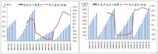 鋼材出口和機(jī)電產(chǎn)品出口情況。1-11月,我國機(jī)電產(chǎn)品出口8427.4億美元,增長32.7%,占同期我國出口總值的59.2%。其中電器及電子產(chǎn)品出口3508億美元,增長31%;機(jī)械設(shè)備出口2795.9億美元,增長33%。機(jī)電產(chǎn)品出口的穩(wěn)步增速是11月份進(jìn)出口數(shù)據(jù)表現(xiàn)強(qiáng)勁的重要貢獻(xiàn)力量。鋼材出口的高增長是去年同期基數(shù)較低的原因所致,由于海外鋼材的供給增加和需求滯后,總體上看,還是持謹(jǐn)慎看待的觀點。