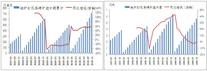 鐵礦石進(jìn)口。11月鐵礦砂及其精礦進(jìn)口量為5738萬噸,與去年同期持平;1至11月,鐵礦砂進(jìn)口5.6億噸,下降0.9%,進(jìn)口均價為每噸126.4美元,上漲59.7%;進(jìn)口金額同比增長58.3%。也就是說,季度定價模式下,在進(jìn)口同等數(shù)量礦石中,多支付一半的費用。