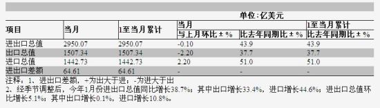 由于受春節(jié)長假的影響,節(jié)前集中進出口的現(xiàn)象比較突出,繼而推動今年1月份我國外貿(mào)的快速增長。今年1月份我國外貿(mào)同比進出口增幅高達43.9%;但較去年12月份仍有0.1%的微幅下降,其中出口環(huán)比下降2.2%,進口環(huán)比增長2.2%。