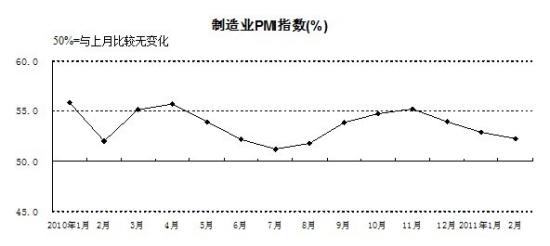 據(jù)國家統(tǒng)計局網(wǎng)站消息,中國物流與采購聯(lián)合會1日發(fā)布的數(shù)據(jù)顯示,受春節(jié)假日等因素影響,2月中國制造業(yè)采購經(jīng)理指數(shù)(PMI)為52.2%,低于上月0.7個百分點。其中,構(gòu)成制造業(yè)PMI的5個分類指數(shù)均有不同程度的回落。自2009年3月以來,該指數(shù)已連續(xù)二十四個月位于臨界點——50%以上的擴(kuò)張區(qū)間,表明中國制造業(yè)經(jīng)濟(jì)總體保持增長態(tài)勢。