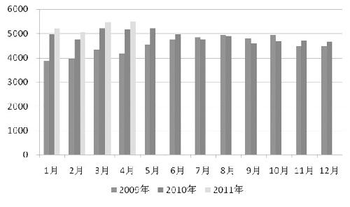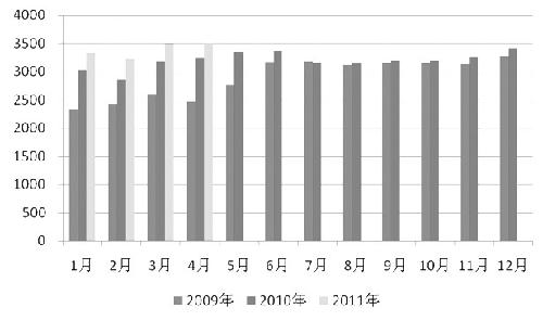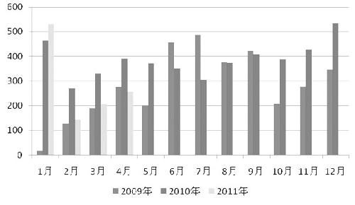 2009—2011年我國冶金煤月度凈進(jìn)口量