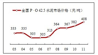 2011年水泥市場仍然延續(xù)高需求、高供給的市場運(yùn)行軌跡,但和往年最大的不同是,價格曲線有了很大變化,就全國范圍講, 價格已脫離了長期在運(yùn)行在300元/噸的低價軌道,2008年以后,一是4萬億投資拉動了市場需求,二是借煤炭價格的上漲,在水泥大企業(yè)的帶動下較好地轉(zhuǎn)移了上游的上漲成本,水泥價格開始向400元/噸沖擊?梢哉f這是進(jìn)入”十二五”對水泥產(chǎn)業(yè)的最大利好。水泥產(chǎn)業(yè)擺脫了長期以來市場低迷得尷尬境地,上游、下游價格上漲,水泥價格原地踏步,甚至走低,使產(chǎn)業(yè)的發(fā)展受到了嚴(yán)重挑戰(zhàn)。在10年水泥工業(yè)高速發(fā)展中成長起來的兩位”大佬”海螺郭文叁、中國建材宋志平攜手進(jìn)入”十二五”,都認(rèn)為未來10年是水泥發(fā)展的黃金10年。
