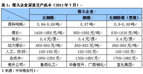 表1分別從無煙煤(小塊、中快、大塊)、煙煤以及無煙粉煤把煤頭尿素企業(yè)分為三類。從結果可以看出:使用無煙塊煤為原料的企業(yè)每噸尿素成本控制在1950-2250元/噸,有些甚至更高;無煙粉煤略低為1700-1980元/噸。當然,這些成本核算是在晉煤在7月將無煙煤價格上調30-50元之后所得出的結果。表中可以看出:使用煙煤的成本最低,但由于大面積推廣煙煤技術有一定難度,所以這部分企業(yè)所占比例極小。絕大多數(shù)的尿素企業(yè)還是那些高成本工藝,且要占到全國煤頭企業(yè)的60%以上。