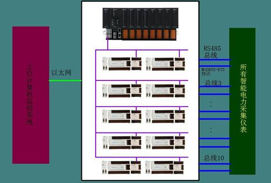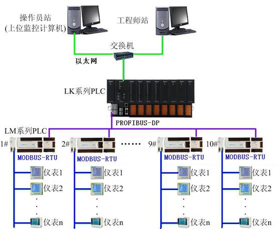 電力采集系統(tǒng)一般由以LK和LM系列PLC為核心的通訊機柜組成。系統(tǒng)裝置如圖2-1所示。電力監(jiān)控柜里配置有1套LK系列PLC,10套LM系列PLC及電源。每套LM系列PLC均有一個RS485接口和一個PROFIBUS-DP接口,其通過RS485串口與智能儀表進行通訊,再通過PROFIBUS-DP總線將讀上來的儀表數據傳送到LK系列PLC中。LK系列PLC通過以太網通訊將匯總的配電室內的所有數據傳送到上位監(jiān)控計算機。
