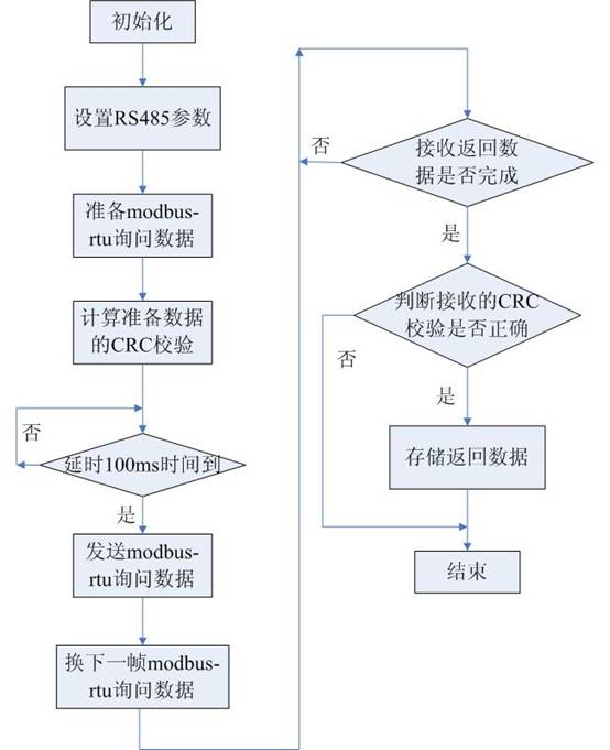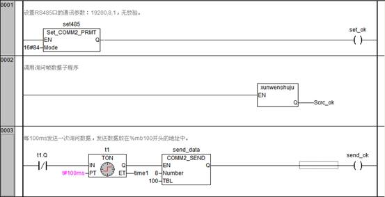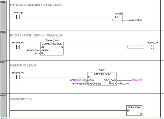 從程序中可以看出所有數據的采集和存儲都是由LM系列PLC完成的。通過RS485進行詢問幀數據的發(fā)送,并對返回的數據進行CRC校驗判斷,若返回的數據不正確,則不進行數據存儲,只有返回數據正確時才將數據放到相應的寄存器中。