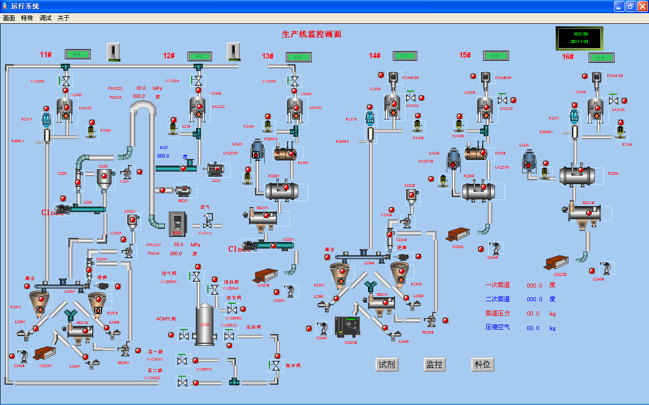 粉料配置控制系統(tǒng)是6條粉料線與對應(yīng)試劑控制線進(jìn)行配比生產(chǎn)反應(yīng)輸送到包裝系統(tǒng),其中包括氣流干燥系統(tǒng)的溫度、壓力由PID控制實(shí)現(xiàn),并有手動設(shè)定功能,控制生產(chǎn)線中的設(shè)備,實(shí)現(xiàn)在上位機(jī)中一鍵自動啟停和聯(lián)鎖,確保生產(chǎn)線的正常運(yùn)行。