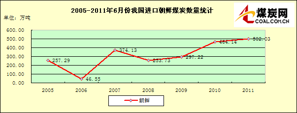 2005-2011年6月份我國進(jìn)口朝鮮煤炭數(shù)量統(tǒng)計