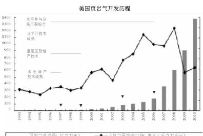 頁巖氣是一種賦存于泥頁巖中,主要以吸附及游離狀態(tài)存在的非常規(guī)天然氣。其發(fā)現(xiàn)于1821年,但由于開采成本相對較高,開發(fā)利用緩慢。直到上世紀(jì)70年代,美國為擺脫對外能源依賴,開始大量投入頁巖氣研究。隨著水平井等關(guān)鍵技術(shù)的突破,開發(fā)成本下降。上世紀(jì)90年代后期,頁巖氣在美國率先實現(xiàn)商業(yè)化、規(guī);2010年美國頁巖氣產(chǎn)量超過1379億立方米,占全國天然氣年總產(chǎn)量的23%,超過俄羅斯成為全球第一大天然氣生產(chǎn)國。