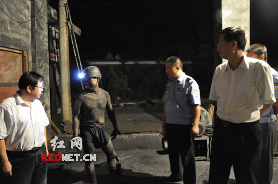 (17日凌晨,耒陽(yáng)市泗馬塘礦。湖南省煤礦監(jiān)督局黨組書(shū)記、局長(zhǎng)宋元明(右一),省煤監(jiān)局黨組成員、總工程師周革忠在突擊檢查中與剛從井下上來(lái)的礦工交談。)