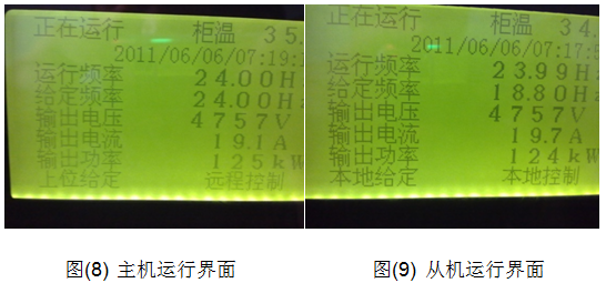HIVERT系列通用高壓變頻器,當(dāng)主機(jī)接收到正常啟動(dòng)信號(hào)后,主機(jī)啟動(dòng)變頻器,同時(shí)將運(yùn)行信號(hào),運(yùn)行頻率及轉(zhuǎn)矩電流發(fā)送給從機(jī),從機(jī)按照主機(jī)發(fā)送過來的數(shù)據(jù)正常啟動(dòng)、運(yùn)行、輸出轉(zhuǎn)矩的控制,從機(jī)本身具備轉(zhuǎn)矩電流的調(diào)節(jié),同時(shí)將自身的轉(zhuǎn)矩電流與主機(jī)發(fā)送過來的轉(zhuǎn)矩電流做比較,從機(jī)會(huì)自動(dòng)調(diào)整自身的運(yùn)行頻率,從而達(dá)到兩臺(tái)變頻器的功率平衡。主機(jī)的運(yùn)行界面如圖(8)所示;從機(jī)的運(yùn)行界面如圖(9)所示。