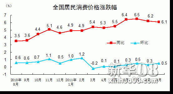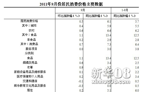 2011年9月份,全國(guó)居民消費(fèi)價(jià)格總水平同比上漲6.1%。其中,城市上漲5.9%,農(nóng)村上漲 6.6%;食品價(jià)格上漲13.4%,非食品價(jià)格上漲2.9%;消費(fèi)品價(jià)格上漲7.3%,服務(wù)項(xiàng)目?jī)r(jià)格上漲3.0%。全國(guó)居民消費(fèi)價(jià)格總水平環(huán)比上漲 0.5%。其中,城市上漲0.4%,農(nóng)村上漲0.6%;食品價(jià)格上漲1.1%,非食品價(jià)格上漲0.2%;消費(fèi)品價(jià)格上漲0.7%,服務(wù)項(xiàng)目?jī)r(jià)格與上月持 平。