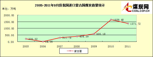 2005-2011年9月份我國(guó)進(jìn)口蒙古煤炭數(shù)量走勢(shì)統(tǒng)計(jì)