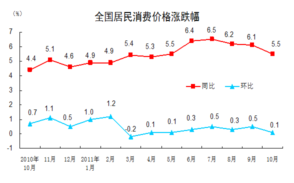 2011年10月份,全國居民消費價格總水平同比上漲5.5%。其中,城市上漲5.4%,農(nóng)村上漲5.9%;食品價格上漲11.9%,非食品價格上漲2.7%;消費品價格上漲6.6%,服務項目價格上漲2.8%。全國居民消費價格總水平環(huán)比上漲0.1%。其中,城市上漲0.1%,農(nóng)村與上月持平;食品價格下降0.2%,非食品價格上漲0.2%;消費品價格上漲0.1%,服務項目價格上漲0.2%。