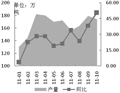 產(chǎn)量方面,2011年10月中國甲醇總產(chǎn)量173.56萬噸,比上月減少2.63%,比去年同期增加50.2%。2011年1—10月份,中國累計生產(chǎn)甲醇1675.08萬噸,比2010年同期增加28.4%。