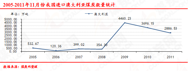 2005-2011年11月份我國進口澳大利亞煤炭數(shù)量走勢統(tǒng)計