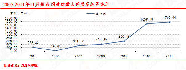2005-2011年11月份我國(guó)進(jìn)口蒙古國(guó)煤炭數(shù)量走勢(shì)統(tǒng)計(jì)