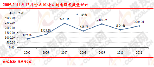 2005-2011年12月份我國進口越南煤炭數(shù)量走勢統(tǒng)計