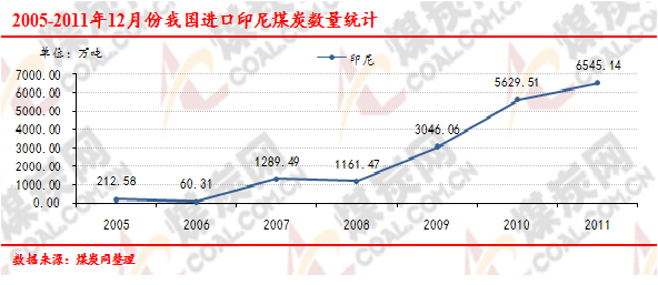 2005-2011年12月份我國(guó)進(jìn)口印尼煤炭數(shù)量走勢(shì)統(tǒng)計(jì)