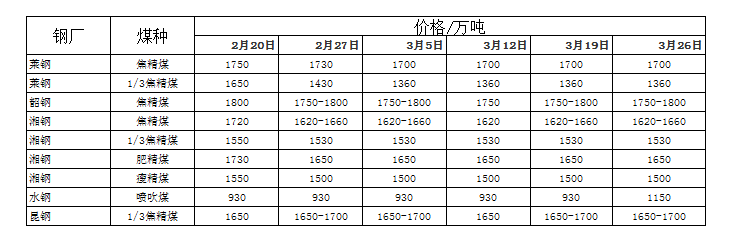 上游方面:三月份國內煉焦煤弱勢盤整,多以維穩(wěn)為主,山西柳林焦煤G85V21S0.5A9車板含稅1620元/噸,鄉(xiāng)寧焦煤G60-70V16-20S0.5A10車板含稅1600元/噸,靈石肥煤G90S30-36S0.6A15-17坑口含稅990元/噸;河北唐山焦煤G80V23-25S1A10Y20出廠含稅1600元/噸;黑龍江七臺河肥煤G100V30S0.3A10Y27車板含稅1630元/噸;山東棗莊1/3焦煤G72V38S0.8A8車板含稅1380元/噸;烏海1/3焦煤G83V30S1.1A11Y20出廠含稅1050元/噸;六盤水焦煤G79V25.3S0.6A10Y20出廠含稅1580元/噸。下個下降空間有限,波動空間逐漸縮小。