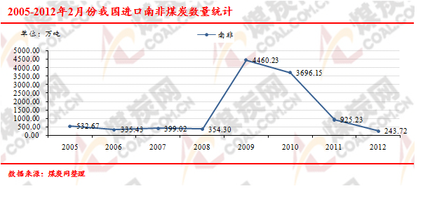 2005-2012年2月份我國進(jìn)口南非煤炭數(shù)量走勢統(tǒng)計(jì)