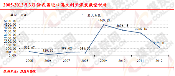 2005-2012年3月份我國進口澳大利亞煤炭數(shù)量走勢統(tǒng)計
