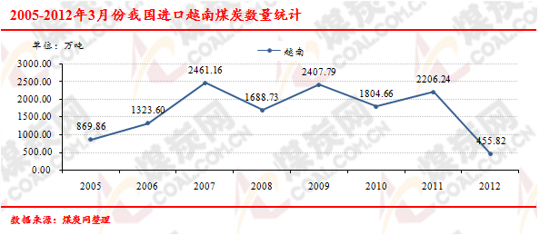 2005-2012年3月份我國(guó)進(jìn)口越南煤炭數(shù)量走勢(shì)統(tǒng)計(jì)