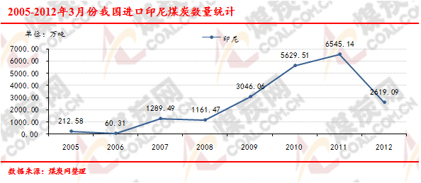 2005-2012年3月份我國進口印尼煤炭數(shù)量走勢統(tǒng)計