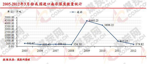 2005-2012年3月份我國(guó)進(jìn)口南非煤炭數(shù)量走勢(shì)統(tǒng)計(jì)