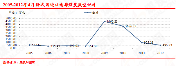 2005-2012年4月份我國(guó)進(jìn)口南非煤炭數(shù)量走勢(shì)統(tǒng)計(jì)