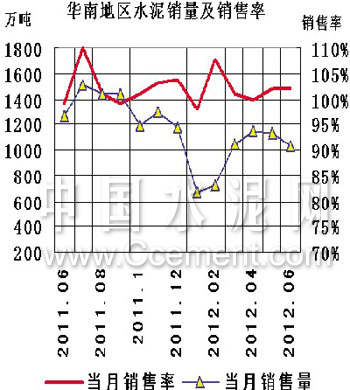 6月華南地區(qū)匯總水泥企業(yè)60家,生產(chǎn)水泥1002.75萬噸,同期比下降14.15%,減少水泥產(chǎn)量165.26萬噸,累計產(chǎn)量5437.36萬噸,同比下降3.35%;6月銷售水泥1023.75萬噸,同比增長2.36%,比去年同期多水泥銷售23.57萬噸,累計銷售水泥5520.02萬噸,同比下降4.10%。6月水泥銷售率102.09%,環(huán)比下降0.35個百分點;6月水泥庫存314.91萬噸,同比增長了5.71%。
