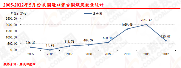 2005-2012年5月份我國(guó)進(jìn)口蒙古國(guó)煤炭數(shù)量走勢(shì)統(tǒng)計(jì)