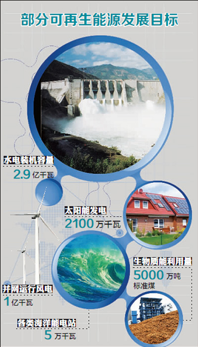根據(jù)《規(guī)劃》,2015年各類可再生能源的發(fā)展目標(biāo)是:水電裝機容量2.9億千瓦(其中抽水蓄能電站3000萬千瓦),累計并網(wǎng)運行風(fēng)電1億千瓦(其中海上風(fēng)電500萬千瓦),太陽能發(fā)電2100萬千瓦,太陽能熱利用累計集熱面積4億平方米,生物質(zhì)能利用量5000萬噸標(biāo)準(zhǔn)煤;各類地?zé)崮荛_發(fā)利用總量達到1500萬噸標(biāo)準(zhǔn)煤;各類海洋能電站5萬千瓦。
