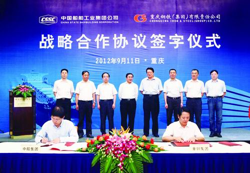 9月11日下午,中國(guó)船舶工業(yè)集團(tuán)公司(下稱“中船集團(tuán)”)、重鋼集團(tuán)在重慶索菲特酒店共同簽署《戰(zhàn)略合作協(xié)議》、《加強(qiáng)非船(非鋼)領(lǐng)域合作框架協(xié)議》、《鋼板、焦煤、鐵礦砂供銷(xiāo)協(xié)議》。