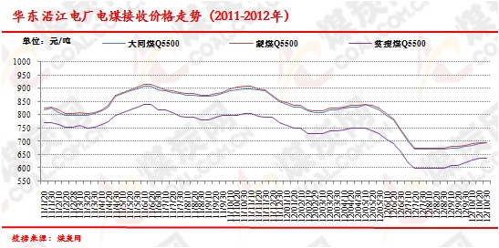 華東沿江電廠方面,最新數(shù)據(jù)顯示,2012年10月下旬,華東沿江電廠電煤接收價格較10月上旬價格基本保持不變,(如下圖),其中,太倉華能、南通華能、上海石洞二電廠接收5000、5500、5800大卡大同煤價格分別為605元/噸、690元/噸、735元/噸;其中太倉華能Q5500動力煤接收價格上漲5元至695元/噸;夏港電廠、揚州二電接收5000、5500大卡蒙煤價格分別為610元/噸、695元/噸;上海石洞一、天生港電廠接收5000、5500大卡貧瘦煤價格分別為585元/噸、635元/噸。